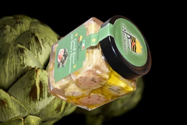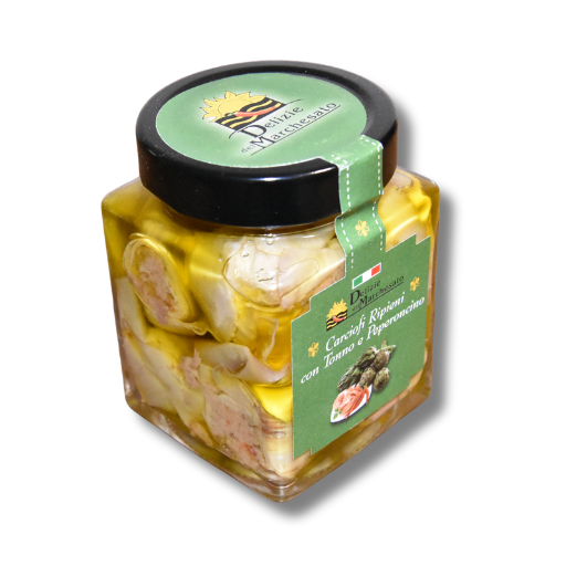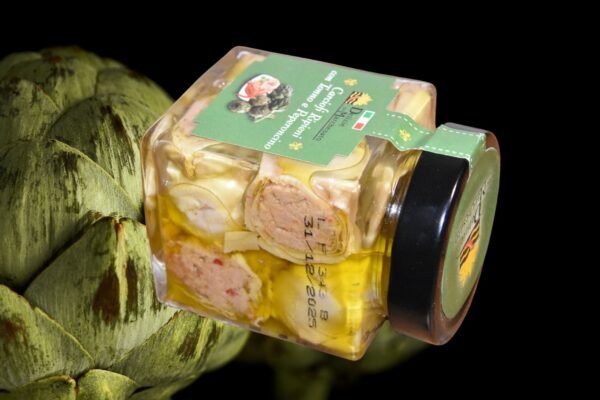 I cuori di carciofo si sposano con un ripieno saporito di tonno e una giusta dose di peperoncino, il tutto conservato in olio extra vergine di oliva. Un equilibrio perfetto tra mare, terra e piccantezza.